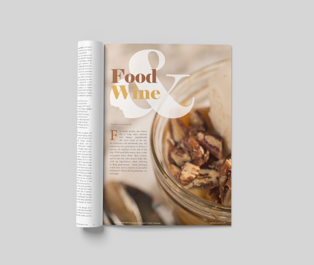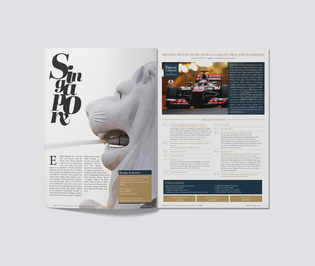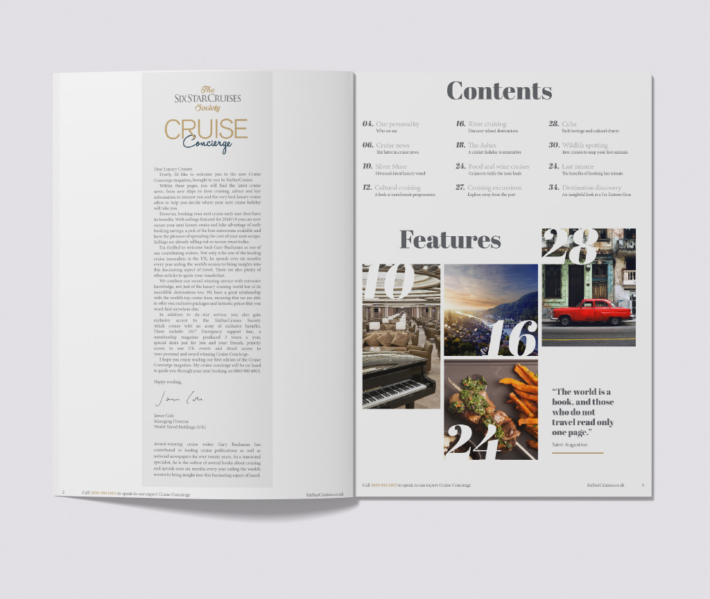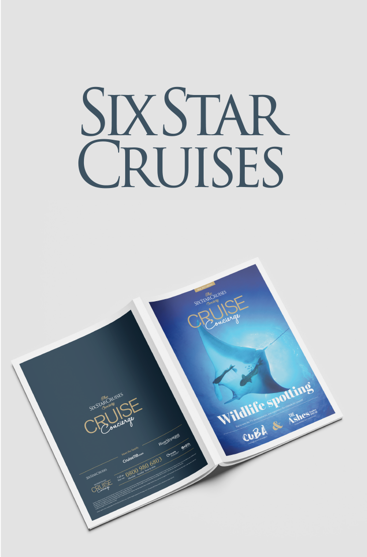 Create a luxury direct mail magazine that showcases Six Star Cruises. Highlight world events and unique cruise destinations with guest articles and tailor made excursion offers to help subtly drive calls and increase enquiries.